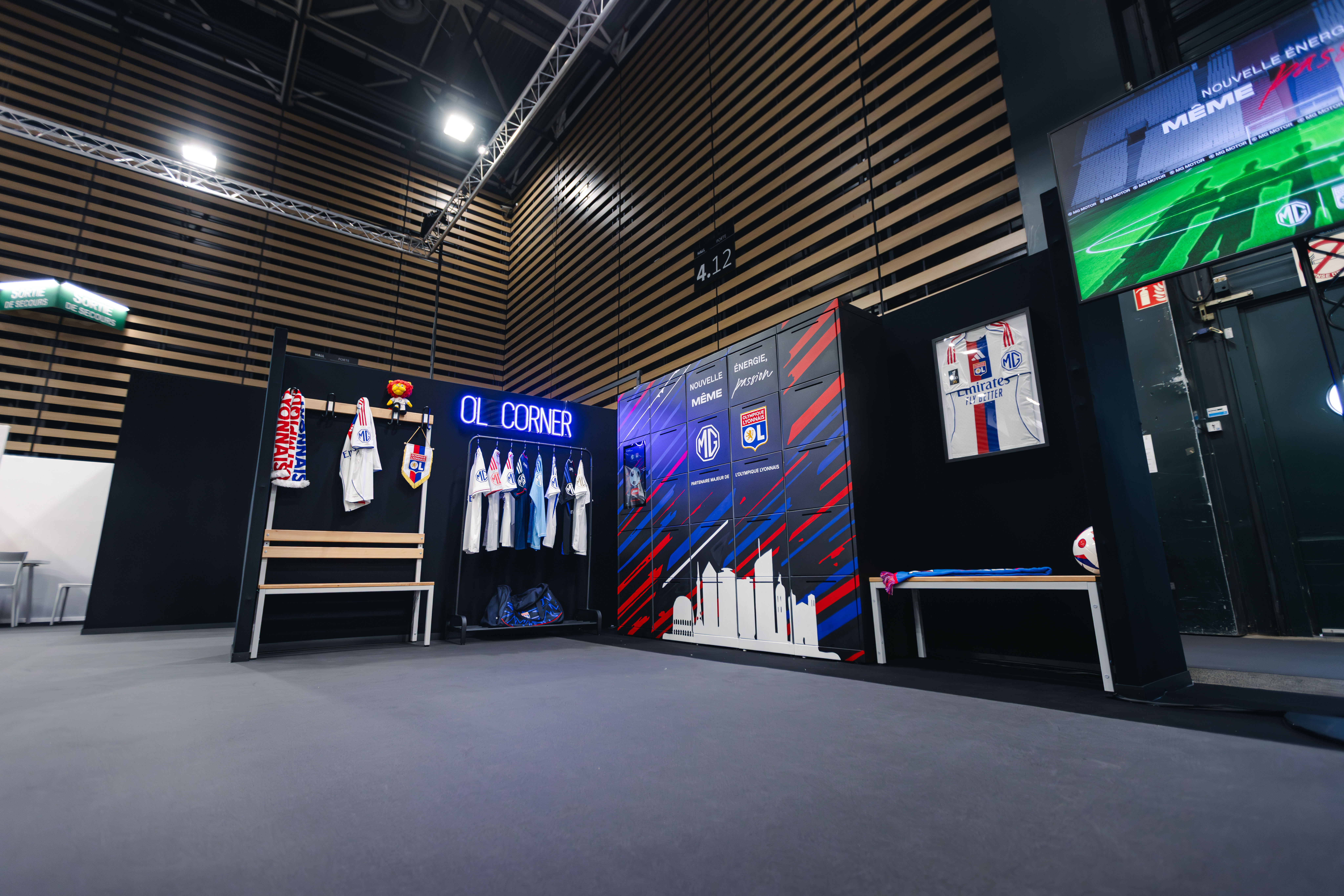 En parallèle de son expertise automobile, MG Motor a surtout souhaité mettre en avant les liens forts de son partenariat avec l’Olympique Lyonnais au sein d’un espace dédié appelé OL Corner. Recréant l’ambiance d’un véritable vestiaire de football avec de nombreux maillots et symboles aux couleurs de l’OL, cet espace permettait aux visiteurs de s’immerger pleinement dans l’univers du club.